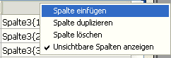 Eine Listbox enthält eine oder mehrere Spalten, deren Inhalt automatisch aufeinander abgestimmt wird. Beim Erstellen enthält eine Listbox standardmäßig eine Spalte. Über das Kontextmenü der Spalte oder die Eigenschaften der Listbox können Sie die Anzahl der Spalten verändern, d.h. Spalten hinzufügen, kopieren oder entfernen.