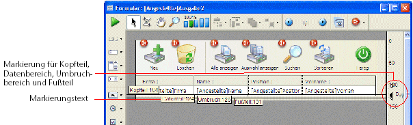 Erstellen Sie ein Listenformular mit dem Formularassistenten, gibt dieser die Bereiche automatisch für Sie vor. Er setzt den Formulartitel, d.h. den Tabellennamen und die Namen der Datenfelder in den Kopfteil und eine oder mehrere Schaltflächen (der genaue Inhalt des Kopteil-Bereichs richtet sich nach den Vorgaben, die Sie im Formularassistenten gewählt haben). Die von Ihnen ausgewählten Datenfelder erscheinen im Datenbereich nebeneinander. Der Formularassistent erstellt einen kleinen Umbruchbereich, schreibt in diesen aber nichts hinein.