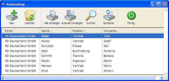 Der Datenbereich wird dynamisch erweitert, wenn das Fenster angepasst wird, während Kopfteil und Fußteil ihre feste Größe behalten. Ein Formular, das Datensätze auf dem Bildschirm anzeigt, kann im Kopfteil weitere klickbare, nicht eingebbare Objekte enthalten wie Schaltflächen, hierarchische Listen, etc..