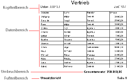 In einem gedruckten Bericht enthält der Kopfteil meistens das Datum, die Uhrzeit, einen Titel und Spaltenbezeichnungen. Die Datensätze erscheinen im Datenbereich. Im Umbruchbereich kann eine berechnete Summe erscheinen. Im Fußteil steht oft die Seitenzahl.