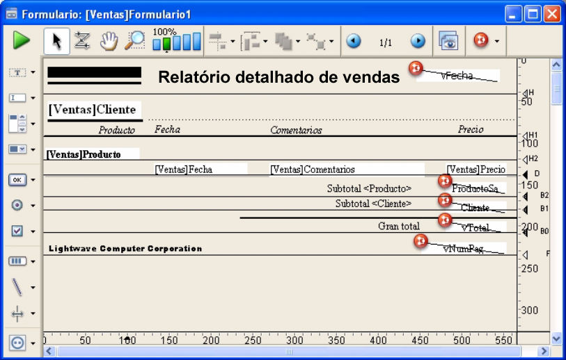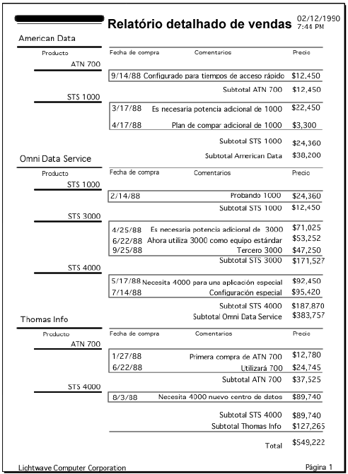Neste exemplo, a página cabeçalho contém a data, a hora e o título do relatório. Os cabeçalhos de quebra contêm o nome do cliente e os cabeçalhos de coluna a informação apresentada durante a primeira quebra. As áreas de detalhe contêm os dados extraídos diretamente dos registros. As áreas de quebra de nível 2 contêm subtotais de produtos vendidos a cada cliente. As áreas de quebra de nível 1 contêm subtotais para cada cliente e a área de quebra de nível 0 contêm o total de vendas. O pé de página contém o número de página.
