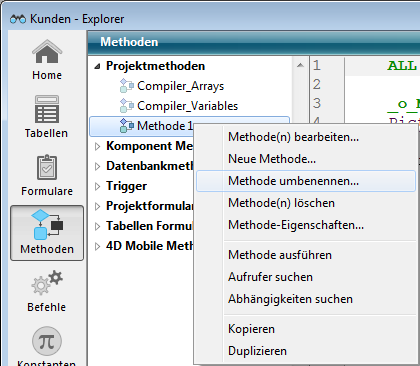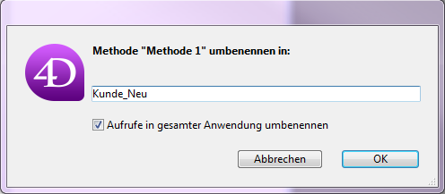 4D bietet Umbenennen mit Auswirkung auf die gesamte Datenbank für Projektmethoden und Variablen. Das lässt sich folgendermaßen ausführen: