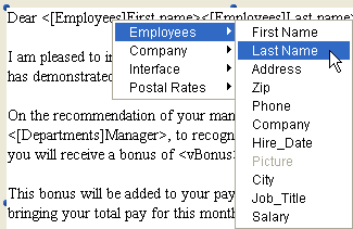- データベース中のフィールドをいずれも使用できます。カレントテーブルのフィールドの場合、テーブル名を指定する必要はありません。つまり以下のように記述できます: <FieldName>。他のテーブルのフィールドを使用する場合、テーブル名を指定する必要があり、以下のように記述します: <[TableName] FieldName>。フォームを印刷する際、テキストエリア中の<FieldName>要素はレコードごとにそのフィールドの値で置き換えられます。