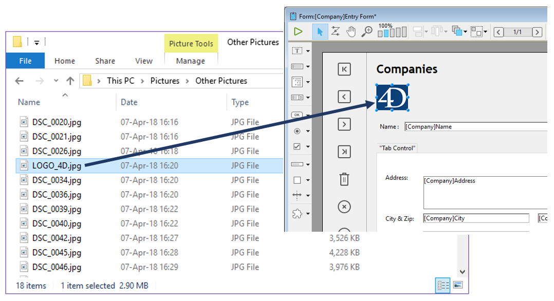 • If you drop the picture on a dynamic object (picture button, 3D button, picture pop-up menu, etc.), 4D automatically sets the "File" picture source and inserts the picture reference into the form as follows:“{pathname+}filename”.