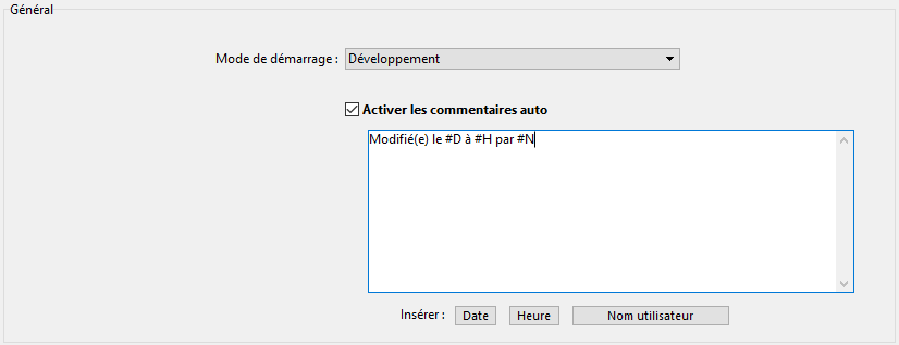 Il est possible d’activer un système de commentaires automatiques — pour les méthodes et les formulaires de la base de données uniquement. Lorsque ce système est activé, un commentaire est automatiquement associé à chaque méthode ou formulaire créé(e) ou modifié(e) dans la base. Un commentaire automatique peut comporter du texte statique (par exemple “Modifié par...”) et des éléments variables (date, heure et utilisateur courant tel que défini dans la table des mots de passe de 4D).