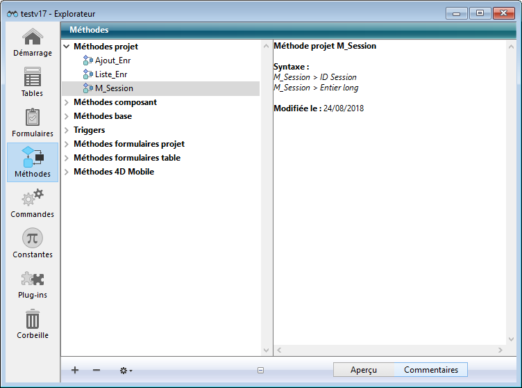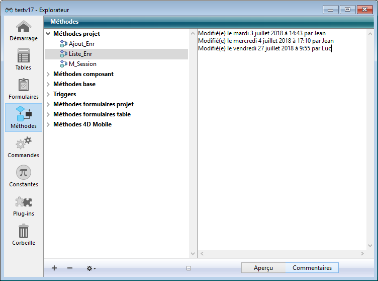 Note de compatibilité : Depuis la version 12 de 4D, les commentaires insérés dans l'en-tête d'une méthode via les caractères // sont affichés sous forme d'infobulles lorsque la méthode est référencée dans une autre méthode (cf. paragraphe "Utiliser les infobulles" dans la section WA FIXER FILTRES LIENS EXTERNES). Cette fonction, très utile pour documenter les méthodes utilisateur, n'est pas compatible avec les commentaires placés dans l'Explorateur. Si vous souhaitez utiliser les en-têtes des méthodes en tant que zones de documentation, ne saisissez pas de commentaires dans l'Explorareur.