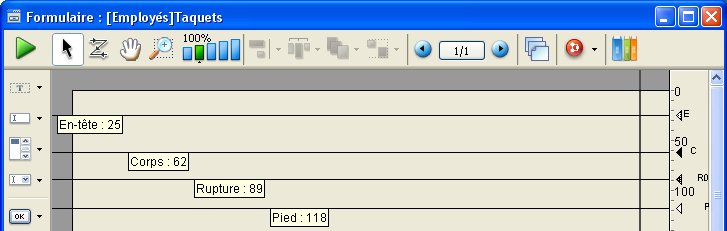 Attention : Les objet actifs (champs ou variables) situés dans le corps des formulaires ne doivent pas chevaucher la zone d’en-tête ou de pied de page, sinon ils ne sont pas affichés lors de l’exécution du formulaire.