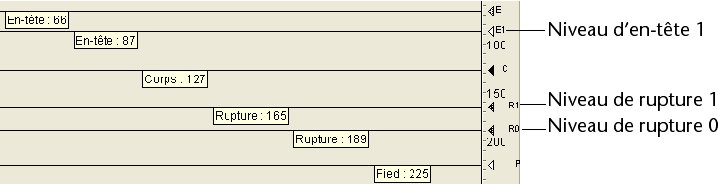 Dans les états imprimés, vous pouvez utiliser plusieurs niveaux de rupture et des ruptures d’en-têtes. Pour créer les zones correspondant à ces niveaux, il est nécessaire de créer des taquets de contrôle supplémentaires.