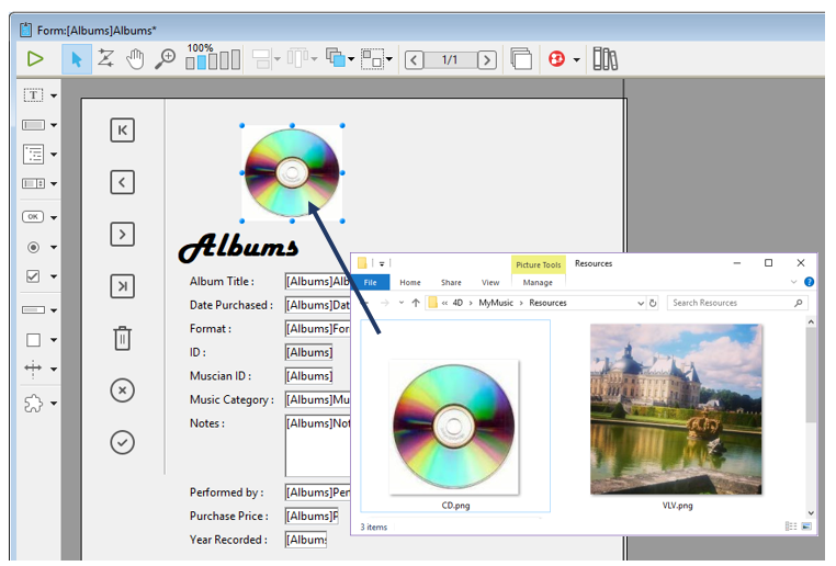 Particularmente, puede llamar imágenes .png (bitmap) o .svg (vectoriales). La inserción de estas imágenes en los formularios puede efectuarse por arrastrar y soltar desde la carpeta Resources: