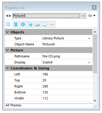 - Por defecto, la imagen insertada será del tipo Imagen de la librería, es decir, 4D conservará el enlace con la imagen original de la librería. Si desea romper este enlace, debe modificar el tipo de la imagen Imagen estática en la Lista de propiedades (ver el siguiente párrafo). Las propiedades de imágenes estáticas y de las imágenes de la librería son generalmente idénticas.