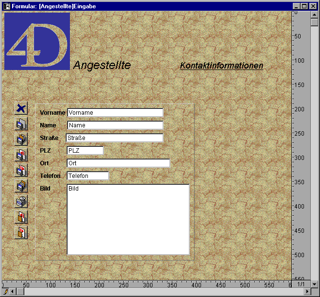 Nehmen wir beispielsweise an, dass alle Eingabeformulare der Datenbank das Firmenlogo und die Schaltflächen OK, Abbrechen, Nächstes und Voriges enthalten sollen. Hierfür erstellen Sie ein Formular mit nur diesen Elementen und rufen es in allen Eingabeformularen als vererbtes Formular auf. Jedes Eingabeformular enthält nun diese gemeinsamen Elemente und zusätzlich eigene Felder und Objekte.