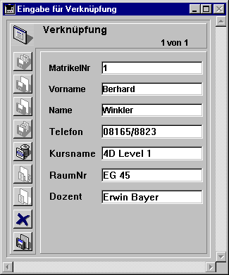 Die Tabelle [Studenten] ist eine Eine-Tabelle. Sie enthält einen Datensatz für jeden Studenten, Namen, und Anschrift. Das Datenfeld MatrikelNr bestimmt jeden Studenten eindeutig. Die Tabelle [Kurse] ist ebenfalls eine Eine-Tabelle. Sie enthält einen Datensatz für jeden Kurs, mit dem Kursnamen und dem Dozenten. Das Datenfeld Kursname bestimmt jeden Kurs eindeutig. Eine Zwischentabelle, nämlich [Verknüpfung] ist für beide anderen Tabellen die Viele-Tabelle. Sie enthält Datensätze für viele Studenten und für viele Kurse. Formulare dieser Tabelle werden für die Eingabe von Daten in beide anderen Tabellen benutzt und für die Anzeige von Informationen in jeder der anderen Tabellen. Mit Hilfe der drei Tabellen werden die Daten effizient gespeichert. Der komplette Datensatz eines Studenten wird nur einmal gespeichert. Zu jedem Kurs gehört ein Datensatz, nur einmal gespeichert. Die Datensätze, die Studenten mit Kursen verknüpfen, werden für jede Einschreibung einmal gespeichert. Sämtliche Informationen stehen aber in jeder beliebigen Zusammenstellung zur Verfügung.