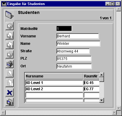 Im obigen Beispiel für Unterformulare können Sie in jedes der Datenfelder Datensätze eingeben. Wenn Sie z.B. in einen Kursdatensatz einen neuen Studenten eingeben wollen, setzen Sie den Tabulator auf den letzten in dem Unterformular gezeigten Studentendatensatz und drücken unter Windows die Tastenkombination Strg+Shift+/, auf Mac OS Befehl+Shift+/, um einen neuen Datensatz zu erstellen (Sie können diese Tastenkombination in den Datenbank-Eigenschaften ändern, siehe ). Wenn Sie den passenden Kursnamen eingeben, werden die weiteren Informationen in dem Datensatz erstellt.