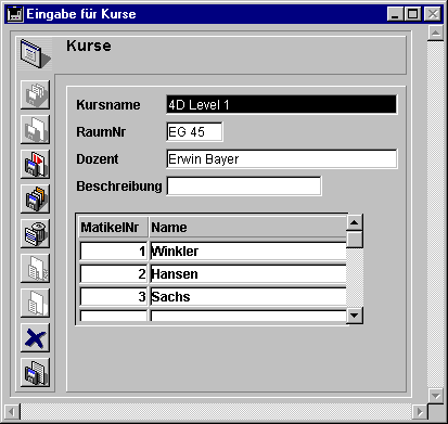 Es handelt sich um einen Datensatz aus der Tabelle [Kurse]. Er zeigt die Informationen zu dem Kurs und in einer Liste die für diesen Kurs eingeschriebenen Studenten. Die Informationen zu den Studenten stammen ebenfalls aus der verknüpften Tabelle. Diese Tabelle enthält die Datensätze, welche die Kurse mit den in diese Kurse eingeschriebenen Studenten verknüpft.