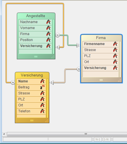 Bei einer rekursiven Verknüpfung sind die Verknüpfungen so angelegt, dass sich die Übertragung von Informationen in einer Schleife totläuft. Die folgende Abbildung zeigt eine rekursive Verknüpfung, bei der die Tabelle [Angestellte] mit der Tabelle [Firma] verknüpft ist, die mit der Tabelle [Versicherung] verknüpft ist, von der eine Verknüpfung zurück zur Tabelle [Angestellte] geht.