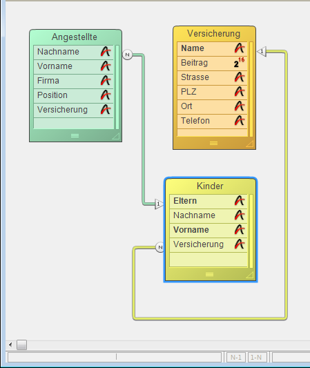 Gleichzeitig besteht aber eine Verknüpfung zwischen der Tabelle [Kinder] und der Tabelle [Versicherung]. Dies bedeutet, dass ein weiterer verknüpfter Datensatz in der Tabelle [Versicherung] geladen wird, der auf dem aktuellen Datensatz, dem ersten Datensatz in der Tabelle [Kinder] basiert. Wenn die Versicherung des Kindes mit der Versicherung der Eltern nicht übereinstimmt, führt diese Verknüpfungsstruktur zu Problemen. Bei diesem Beispiel stoppt 4D den weiteren Ablauf der Verknüpfungen nicht. Es werden beide Verknüpfungen durchgeführt, aber nicht gleichzeitig. Wenn Sie diese Art von Struktur benutzen wollen, müssen Sie die Tabellenverknüpfungen manuell aktivieren und die Befehle der 4D Programmiersprache benutzen.