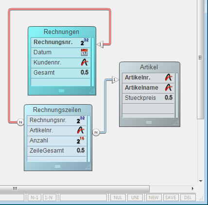 Da es in einer Tabelle nur einen aktuellen Datensatz gibt, werden die Verknüpfungen nicht für alle Datensätze einer Auswahl hergestellt. Nehmen wir als Beispiel die Datenbank Rechnungen mit folgender Struktur: