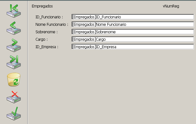 Como os formulários de projeto estão desenhados principalmente para serem utilizados no contexto do comando DIALOG, as ações padrões relativas à gestão de registros (Próximo registro, Excluir registro, etc.) não aparecem por padrão no editor nem o assistente de criação de formulários. Você deve administrar a visualização e modificação de registros utilizando os comandos na linguagem de programação.
