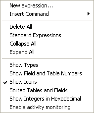 You can add a New Expression or a 4D Command, or perform global actions: Delete All, display all the Standard Expressions, Collapse All or Expand All.