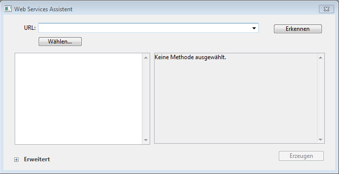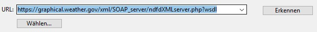 Die Schaltfläche Wählen zeigt einen Standard-Öffnen Dialog, um eine lokal gespeicherte WSDL auszuwählen. Der Pfadname wird dann im Bereich URL angezeigt. Er beginnt mit “Datei://”. Sie können ihn auch manuell eingeben.