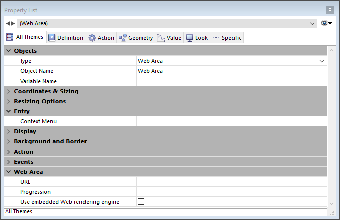 フォームエディターでWebエリアを選択すると、プロパティリストには専用のプロパティが表示されます: